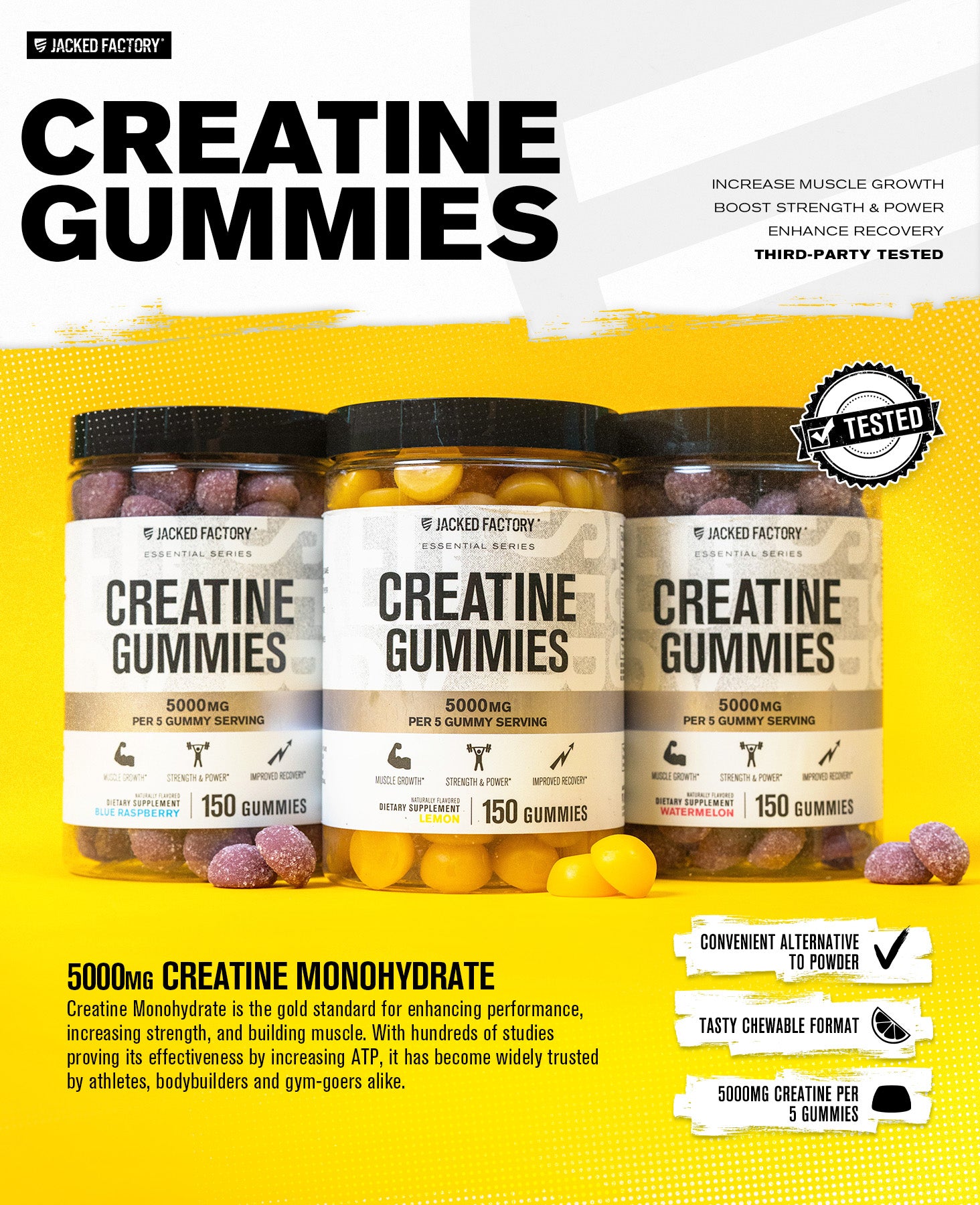 Each 5-gummy serving delivers 5000mg of Pure Creatine Monohydrate, the gold standard for muscle growth, strength, and recovery.