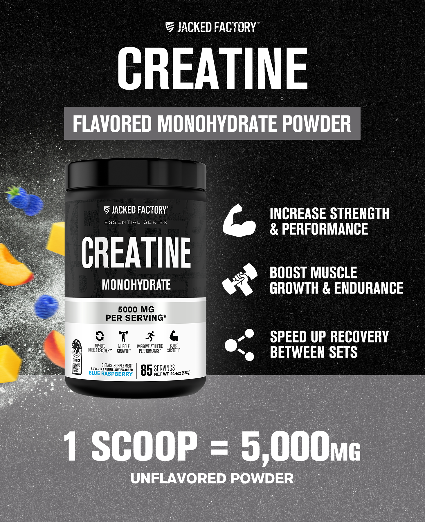 Jacked Factory Creatine Monohydrate powder features 5,000 mg of unflavored, pure creatine monohydrate in every scoop. Creatine Monohydrate remains the gold standard of creatine supplements, with hundreds of studies proving its effectiveness in athletes, bodybuilders, and gym-goers alike. Our creatine powder mixes easily in virtually any liquid and can be stacked with your favorite powder supplements, such as pre-workout and BCAAs.